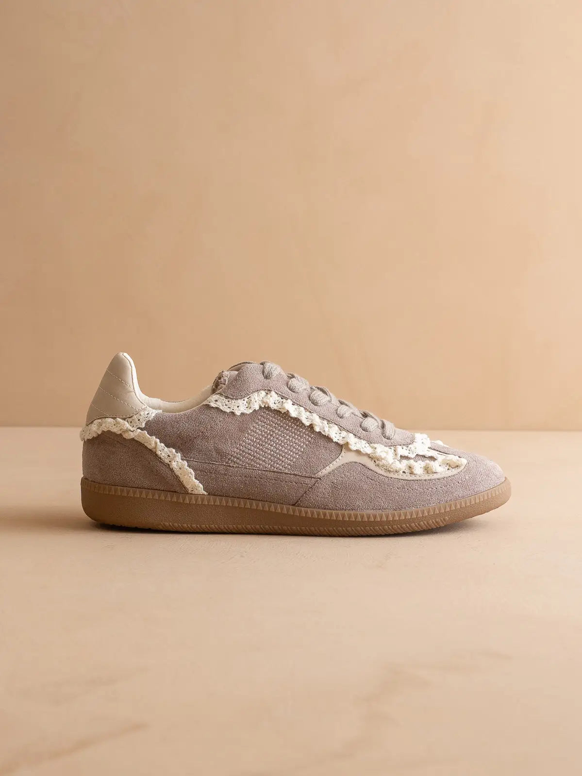 A vintage-inspired sneaker with feminine charm. The APRIL pairs classic gum soles and tonal panels with atelier-selected materials and delicate lace trim for a subtle, romantic twist on everyday style. Finished with cushioned insoles for all-day comfort.