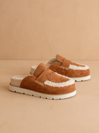 The Avalon Caramel Suede Shearling Cozy Loafer Mule