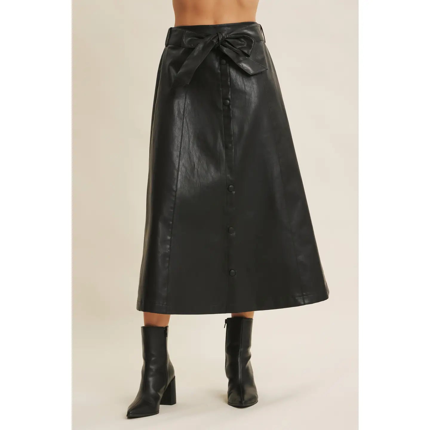 Turn heads with the Liv Midi Skirt, a playful blend of edgy style and vegan-friendly faux leather. Featuring a chic belted waist, this skirt adds structure and flair to your outfit. Its midi length strikes the perfect balance between bold and versatile, making it ideal for any occasion where you want to stand out.