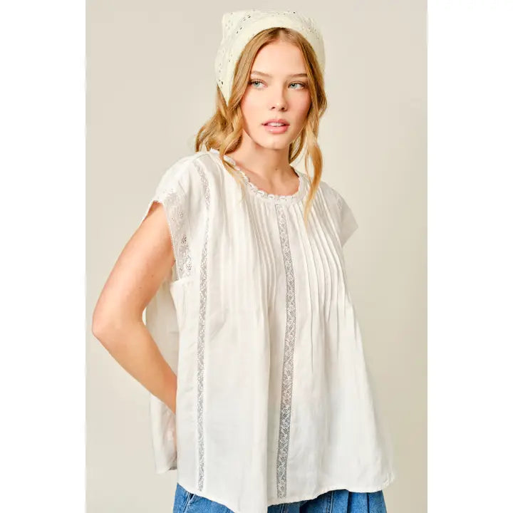 Delicate lace accents add a romantic touch, elevating the classic silhouette with subtle texture and charm. The relaxed, flattering fit makes it easy to pair with denim for a casual look or style with trousers or skirts for a more polished outfit.