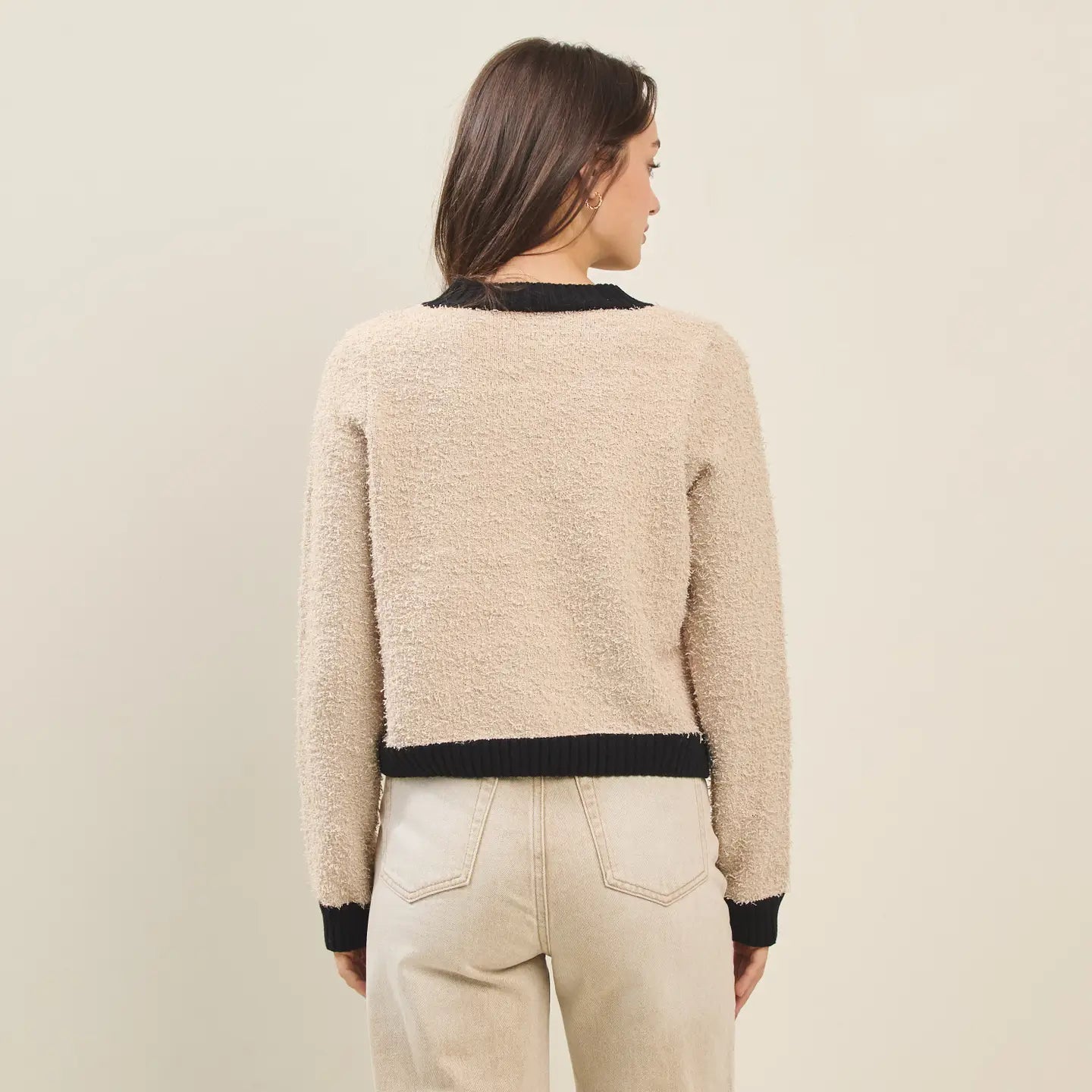 Featuring a button-up front and finished with contrast black trim, it delivers a classic, tailored look with a modern edge. Perfect worn on its own or layered over a blouse or tee, this cardigan pairs seamlessly with denim, trousers, or skirts for both casual and polished styling.