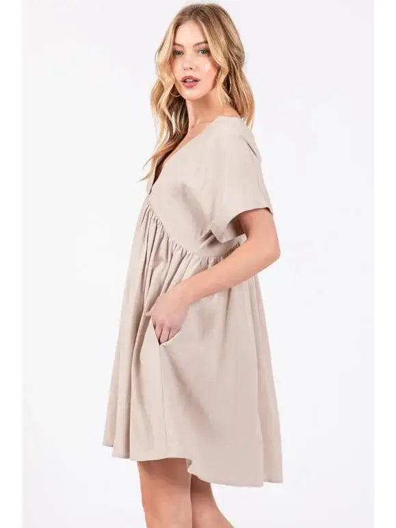 Experience effortless charm in this breezy babydoll mini dress featuring a flattering V-neck and functional side pockets. The chic cuffed sleeves and playful tassel tie-back detail make this the ultimate "grab-and-go" staple for sun-drenched days and casual evenings.