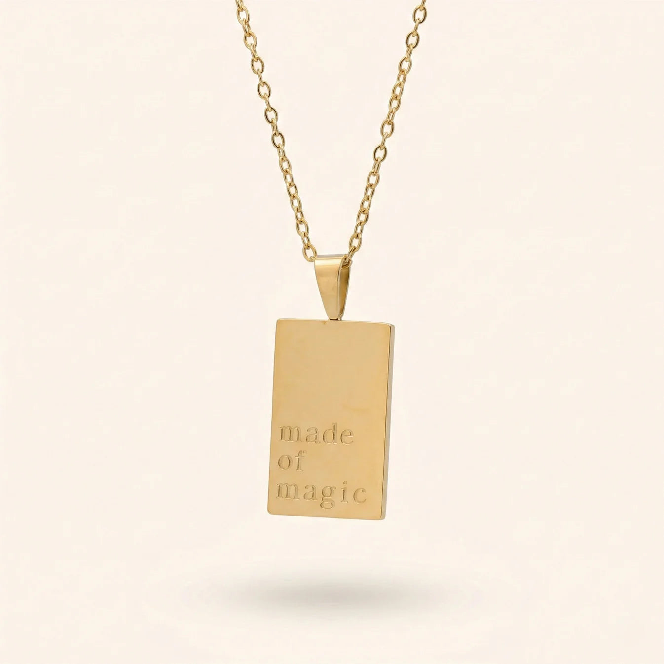 Radiate everyday enchantment with this sleek 18k gold bonded "Made of Magic" pendant. This hypoallergenic, tarnish-resistant statement piece is the ultimate daily reminder of your inner power and worth.
