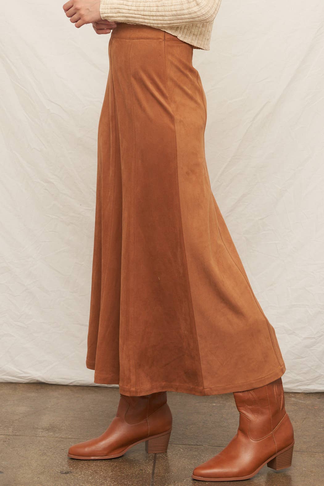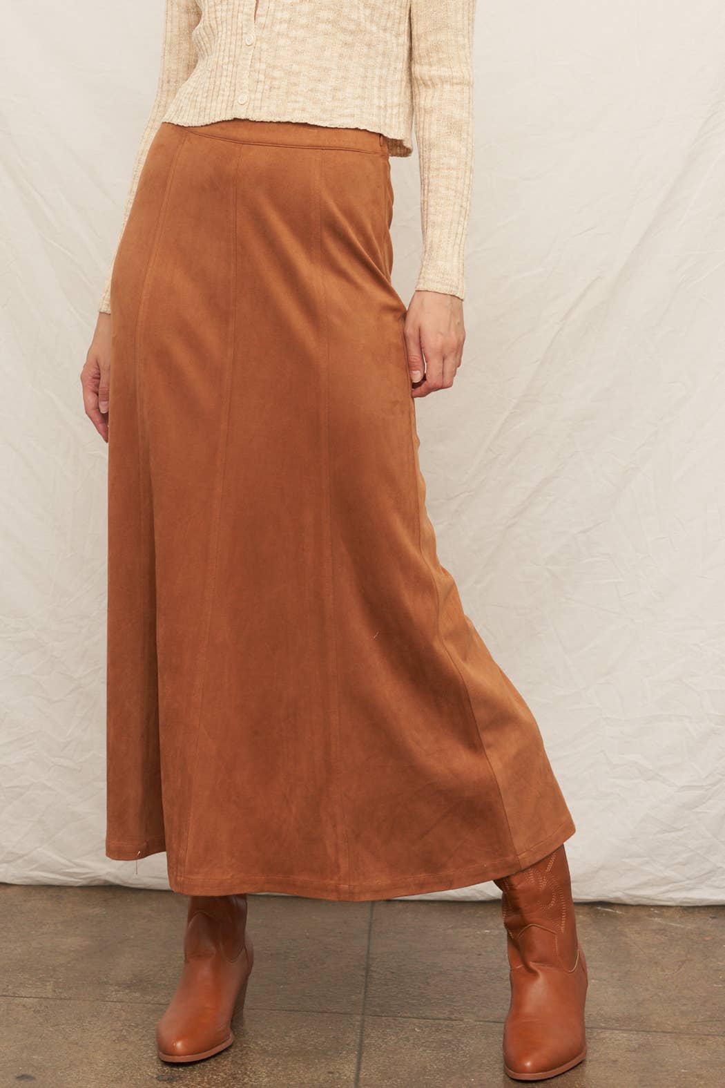 Suede Maxi Skirt 90% Polyester 10% Spandex Size S(2) - M(2) - L(2) Made in China * MODEL IS 5'8" AND IS WEARING A SMALL.